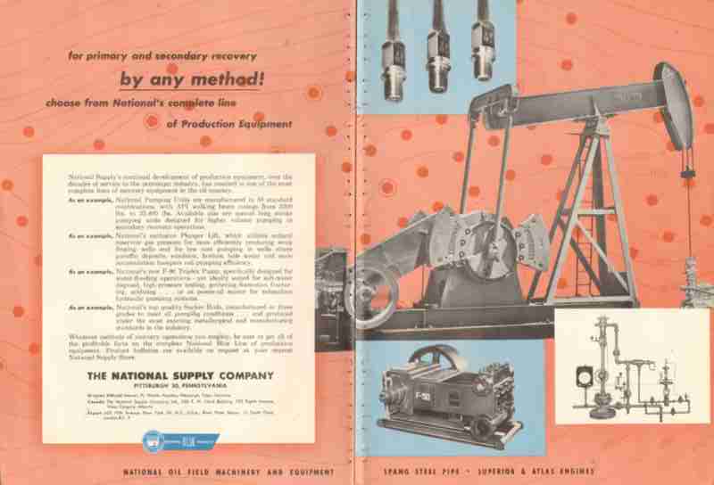 Original oil and gas trade magazine vintage ad for THE NATIONAL SUPPLY COMPANY of Pittsburgh, PA.  Treasure map for new pay. Finding gold in their own back yard is a term that is rapidly being applied to more and more hitherto depleted oil reservoirs. Through the technique of modern water flooding, a growing number or fields are substantially increasing their yields and even near depleted pools are being stored to profitable operations.  Keep your eye on National Blue for everything that is profitably modern in both production and drilling equipment. This unique 1953 old multi-page petroleum industry magazine advertisement would display beautifully matted and framed. Four page gatefold advertisement.