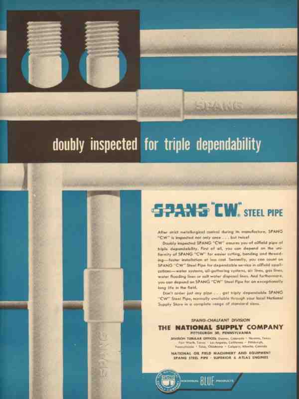 Original oil and gas trade magazine vintage ad for THE NATIONAL SUPPLY COMPANY of Pittsburgh, PA. Spang Chalfant Division. Spang CW Steel Pipe, Double Inspected for Triple Dependability. For all oilfield applications. Unique 1953 old oilfield petroleum pipe industry equipment magazine advertisement. Nice graphics.