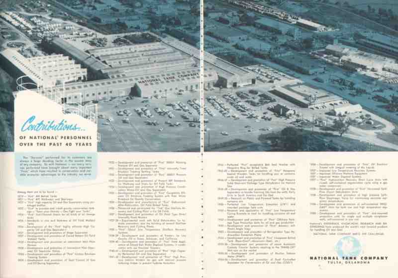 Original oil and gas trade magazine vintage ad for NATIONAL TANK COMPANY, of Tulsa, OK. Contributions of Personnel over the past 40 Years. Our many services performed have brought about many important firsts which have resulted in conservation and notable economic advantages to the industry we serve. Pictured is a birds-eye view of the plant. This unique 1959 old oilfield petroleum industry equipment magazine advertisement would display beautifully matted and framed. Two page gatefold advertisement.