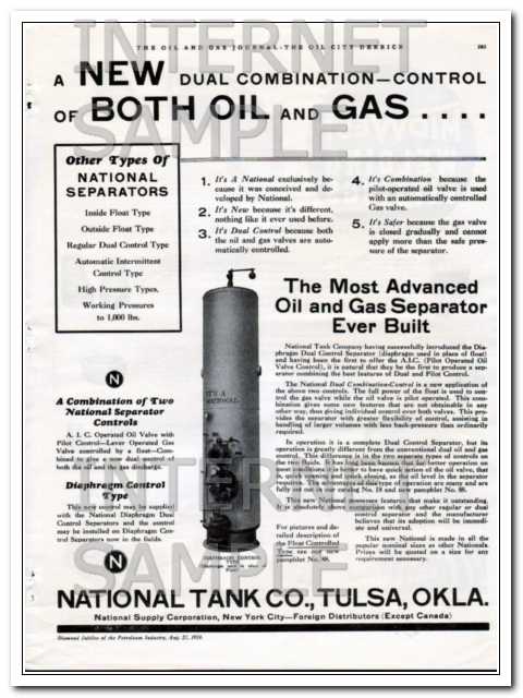 Original oil and gas trade magazine vintage ad for NATIONAL TANK COMPANY of Tulsa, OK.  A New Dual Combination Control of Both Oil and Gas. The Most Advanced Separator Ever Built. Diaphragm Control Type. This unique 1934 old petroleum gas industry equipment magazine advertisement would display magnificently matted and framed. Approximate size  10.5 x 13 inches.