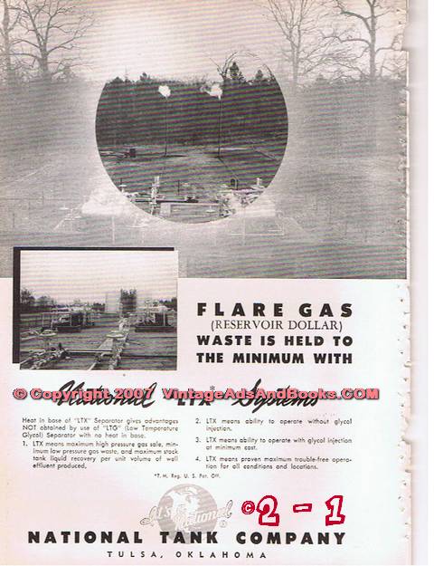 Original oil and gas trade magazine vintage ad for NATIONAL TANK COMPANY, of Tulsa, OK. Flare Gas. Waste is held to the minimum with National LTX Systems. Unique 1955 old petroleum gas industry equipment magazine advertisement. Approximate size 9 x 12 inches.