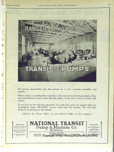 Original oil and gas trade magazine vintage ad for NATIONAL TRANSIT PUMP & MACHINE COMPANY, of Oil City, PA. District Offices were listed in: New York City, NY, Philadelphia, PA, Pittsburgh, PA, Cleveland, OH, Houston, TX, Tulsa, OK and Denver, CO. Photo shows 6 Transit Pipeline Pumps at Ranger, Texas field. Unique 1928 old petroleum pipe line industry equipment magazine advertisement. Nice graphics. Approximate size 10 x 13 inches.