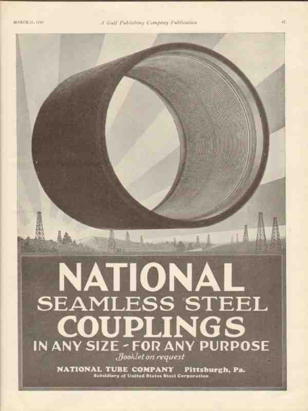 Original oil and gas oilfield drilling industry trade magazine vintage ad for NATIONAL TUBE COMPANY of Pittsburgh, PA. National Seamless Steel Couplings In Any Size for Any Purpose. Subsidiary of United States Steel Corporation. Old 1930 petroleum equipment magazine advertisement.
