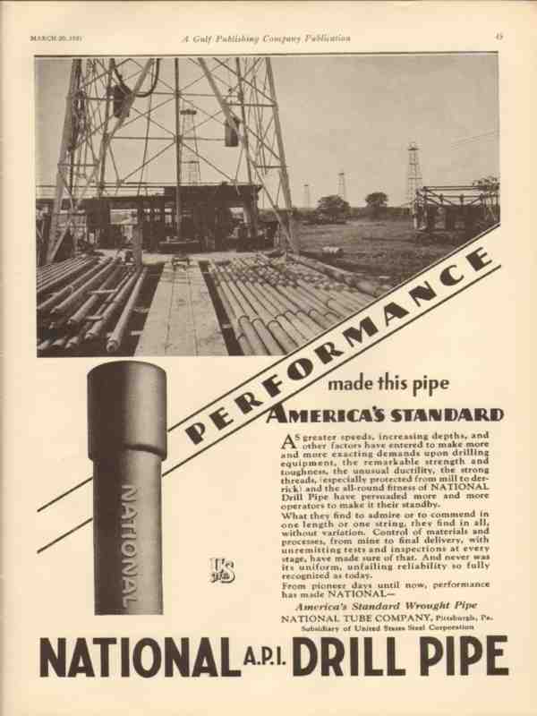 Original oil and gas trade magazine vintage ad for NATIONAL TUBE COMPANY of Pittsburgh, PA.  Performance Made This Drill Pipe America's Standard. This unique 1931 old oilfield petroleum drilling industry pipe equipment magazine advertisement would display beautifully matted and framed. Nice graphics.