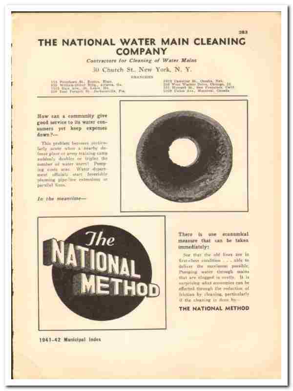 Original 1941 municipal trade vintage catalog for the NATIONAL WATER MAIN CLEANING COMPANY. Main office was located at 30 Church Street, New York, NY.
