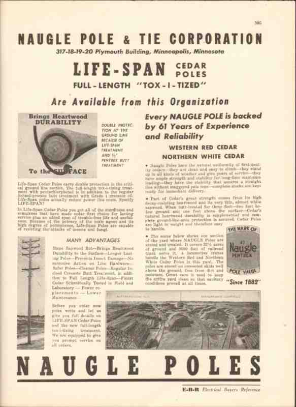 Original wood trade vintage catalog for NAUGLE POLE & TIE CORPORATION, was located at 317-20 Plymouth Building, Minneapolis, MN. Manufacturers of Life-Span Tox-I-Tized cedar poles in western red and northern white cedar. Double protection at the ground line. Naugle poles have the natural uniformity of first quality cedars. They are clean and easy to climb, stand up in all kinds of weather and give years of service. Disbound from a large 1943 electrical construction materials book, this unique old one page technical brochure would display wonderfully matted and framed. A marvelous addition to your retro electric equipment library.