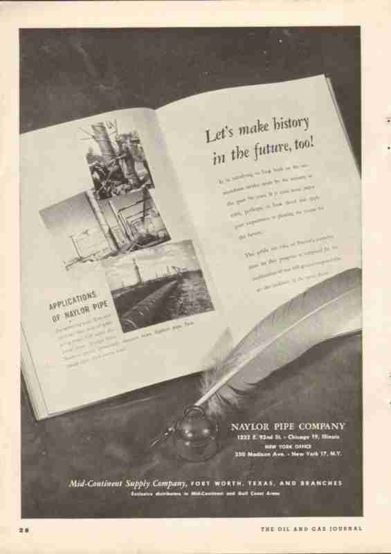 Original oil and gas trade magazine vintage ad for NAYLOR PIPE COMPANY, was located at 1232 E. 92nd St, Chicago, IL. The New York City Office was located at 350 Madison Ave, New York, NY. Mid-Continent Supply Company, of Fort Worth, TX, and all Branches. Let's make history in the future, too! This unique 1951 old oilfield petroleum pipe industry magazine advertisement would look sensational matted and framed. Nice graphics. Approximate size 9 x 12 inches.