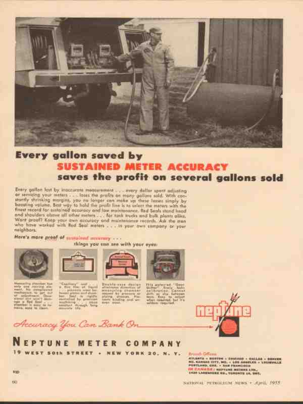 Original oil and gas trade magazine vintage ad for NEPTUNE METER COMPANY, was located at 19 West 50th Street, New York City, NY. Every Gallon Saved by Sustained Meter Accuracy, Saves the Profit on Several Gallons Sold. Tank trucks with Red Seals Meters. Unique 1955 old gasoline delivery truck equipment magazine advertisement.