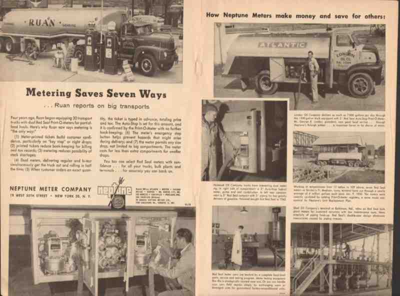 Original old petroleum transportation trade magazine vintage ad for NEPTUNE METER COMPANY of New York City, NY. Metering saves seven ways on big transports Ruan reports. Trucks equipped with red seal print-o-meters at London Oil Company, with George E. London president, Shell Oil terminal at Baltimore, MD. This unique 1957 2 page gatefold oil and gas advertisement would display beautifully matted and framed.