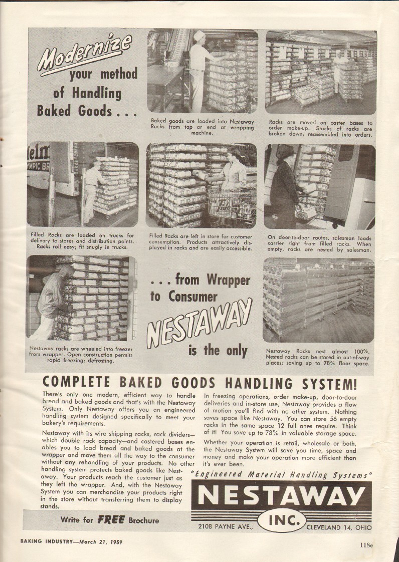 Original commercial bakery trade magazine vintage ad for NESTAWAY INC in Cleveland, OH. Complete baked goods handling system from wrapper to consumer. Wire shipping racks, dividers, castered bases allow moving products without rehandling of your products. 1959 unique old baking industry advertisement.