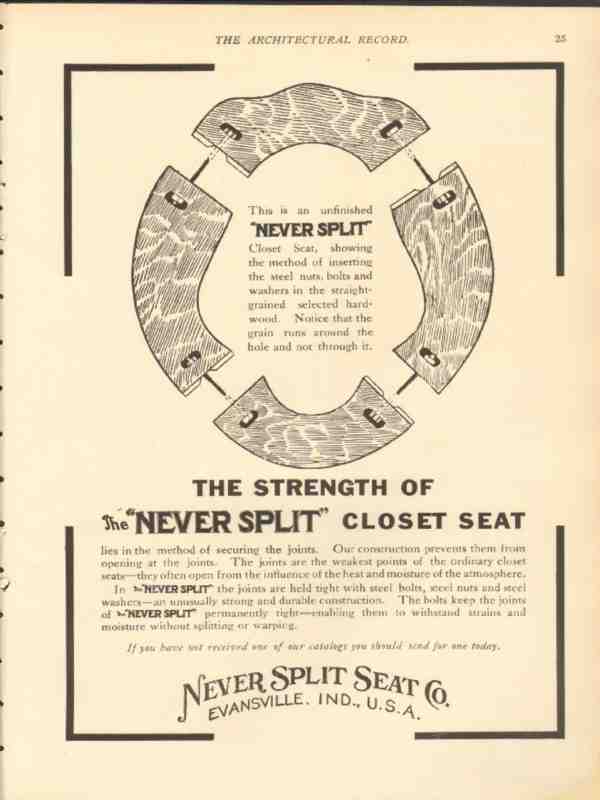 Original vintage architectural trade magazine ad for NEVER SPLIT SEAT COMPANY of Evansville, IN. Shown is an unfinished Never Split Closet Seat showing the method of inserting the steel nuts, bolts and washers in the straight-grained selected hardwood. Old 1912 construction industry advertisement.