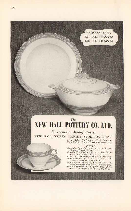 Original pottery vintage ad for NEW HALL POTTERY COMPANY LTD. Nirvana Shape earthenware 1007, 1008. Agents in Australia, Chile, South Africa, USA.