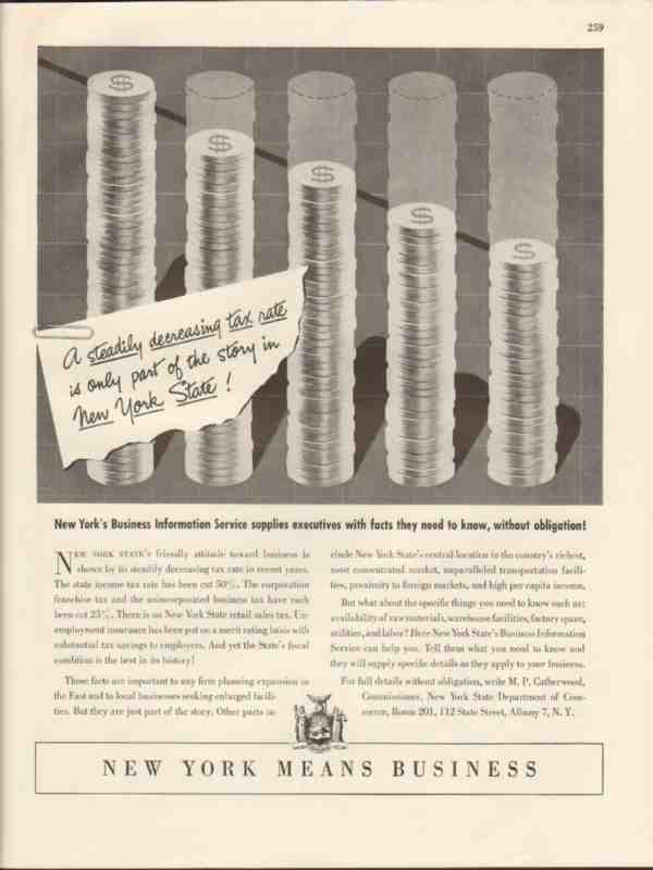 Original old financial industrial trade magazine ad for NEW YORK. Department of Commerce, New York State Business Information Service. M.P. Catherwood, Commissioner. This 1947 magazine advertisement would display beautifully matted and framed.