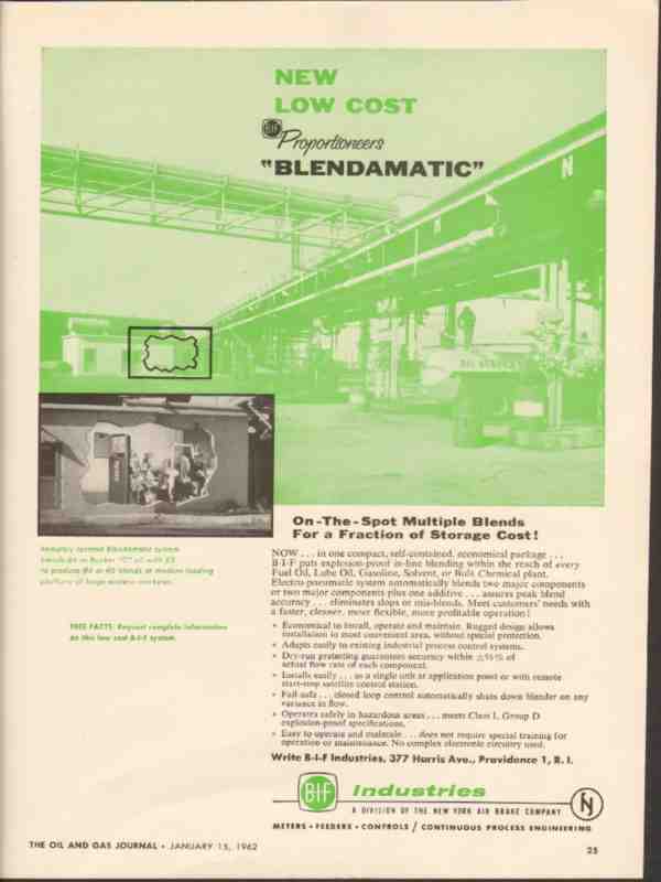 Original oil and gas trade magazine vintage ad for NEW YORK AIR BRAKE COMPANY, B-I-F Industries division, was located at 377 Harris Avenue, Providence, RI. New Low Cost B-I-F Proportioneers Blendamatic. On the spot multiple blends for a fraction of storage costs. This unique 1962 old petroleum chemical industry magazine advertisement would display beautifully matted and framed.