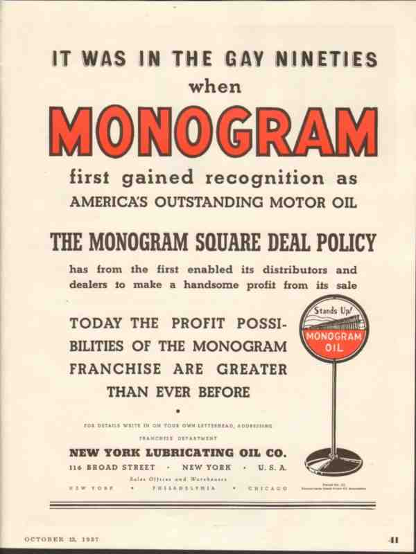 Original oil and gas trade magazine vintage ad for NEW YORK LUBRICATING OIL COMPANY, was located at 114 Broad Street, New York City, NY. In the Gay Nineties when Monogram First Gained Recognition as America's Outstanding Motor Oil. This unique 1937 old retail service station industry magazine advertisement would display beautifully matted and framed. Nice graphics.