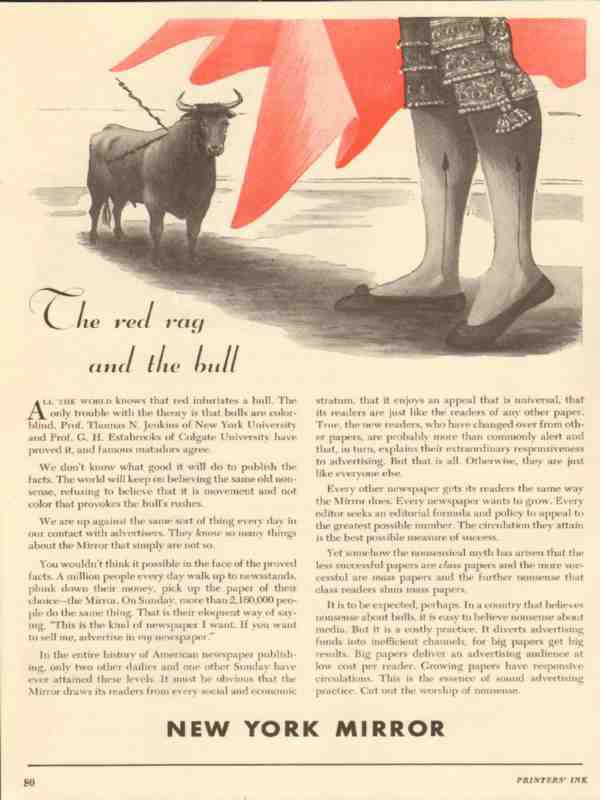 Original vintage newspaper advertising media trade magazine ad for NEW YORK MIRROR. The Red Rag and the Bull. All the world knows that red infuriates a bull. The only trouble with the theory is that bulls are colorblind. Prof. Thomas N. Jenkins of New York University and Prof. G. H. Estabrooks of Colgate University have proved it and famous matadors agree. We are up against the same sort of thing every day in our contact with advertisers. They know so many things about the Mirror that simply are not so. Cut out the worship of nonsense. Old 1947 antique newspaper advertising and printing industry advertisement, would display beautifully matted and framed.
