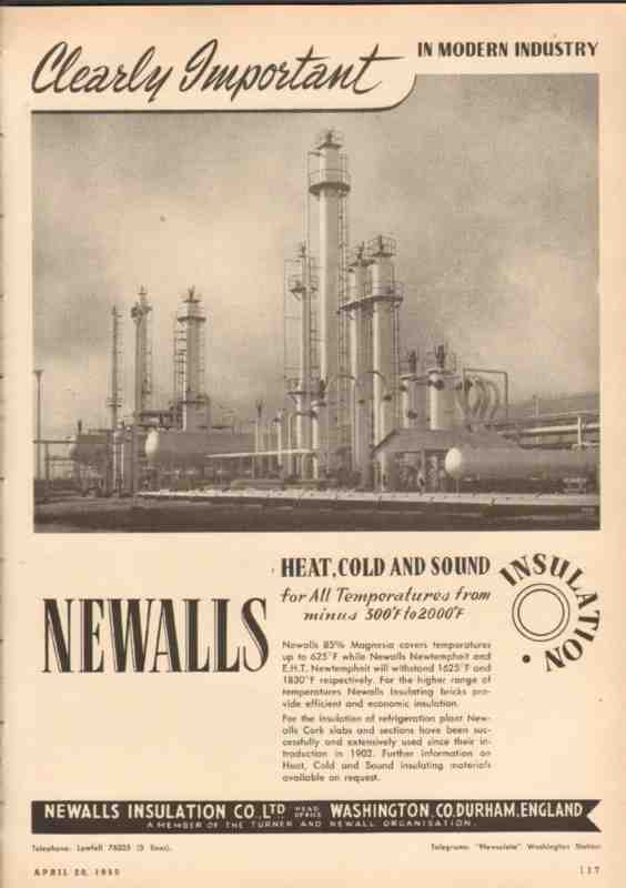 Original oil and gas trade magazine vintage ad for NEWALLS INSULATION COMPANY LIMITED of Washington, County Durham, England. Heat, Cold and Sound Insulation for all temperatures from minus 300 to 2000 degrees F. Magnesia, Newtempheit, insulating bricks, cork slabs and sections are used. A member of the Turner and Newall Organization. This unique 1950 old petroleum refining process industry equipment magazine advertisement would display beautifully matted and framed.