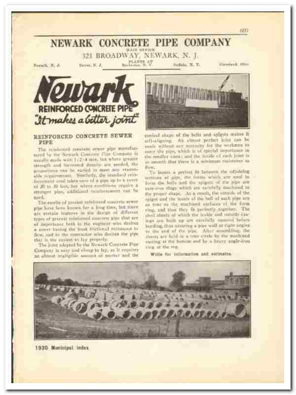 Original 1930 concrete trade vintage catalog for the NEWARK CONCRETE PIPE COMPANY. Main office was located at 323 Broadway, Newark, NJ. The plants were located in Newark, NJ, Dover, NJ, Rochester, NY, Buffalo, NY, and Cleveland, OH.