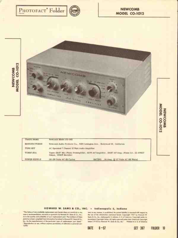 Vintage NEWCOMB model CO-1012 COMPACT 1012 6 tube 7 channel 12 watt amplifier. Original old Sams Photofact manual includes schematics, layouts, voltage & resistance readings, parts list. 5 pages. Dated 1957. Newcomb Audio Products Company of Hollywood, CA.