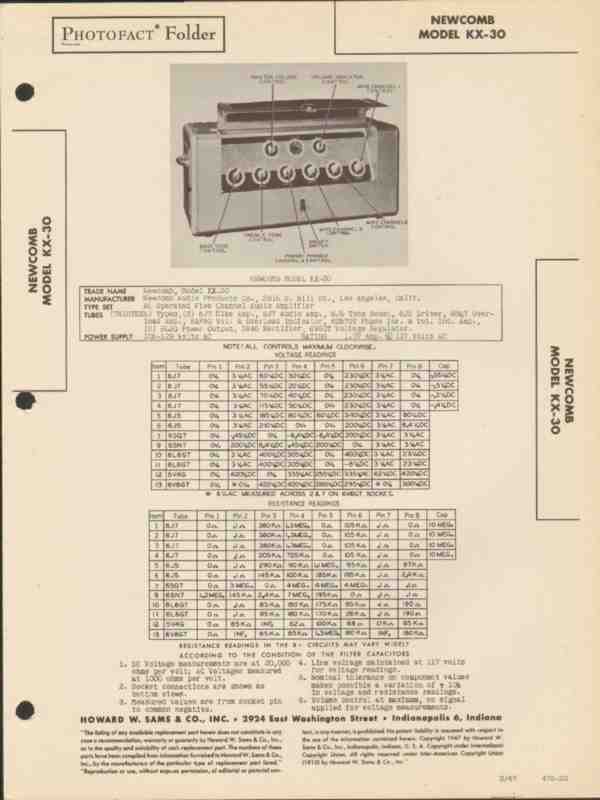 Vintage NEWCOMB model KX-30 13 tube 5 channel audio amplifier. Original old Sams Photofact manual includes schematics, layouts, voltage & resistance readings, parts list. 6 pages. Dated 1947. Newcomb Audio Products Company of Los Angeles, CA. This manual would make a sensational accompaniment to your vintage audio equipment.