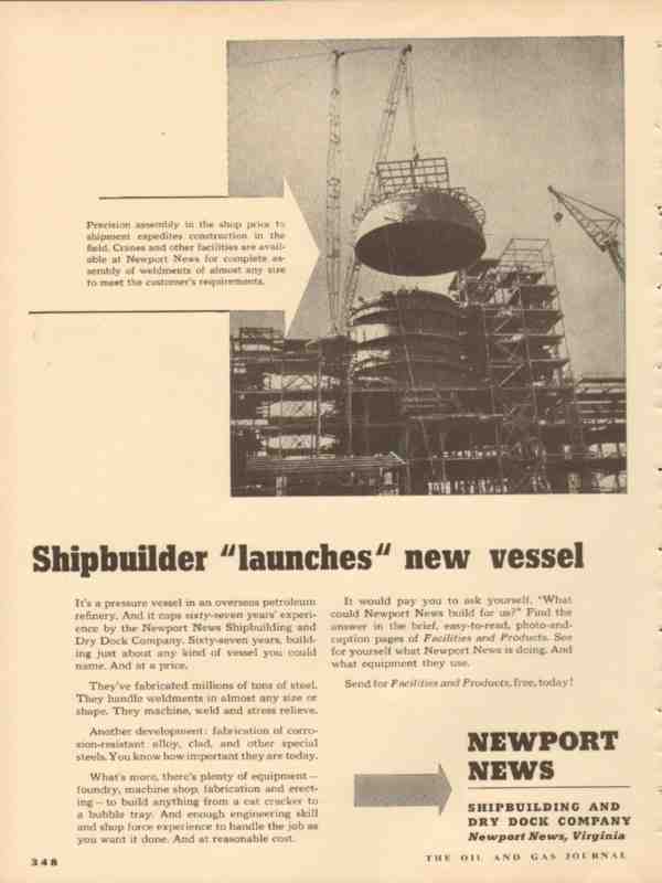 Original vintage oil and gas trade magazine ad for NEWPORT NEWS SHIPBUILDING DRY DOCK COMPANY of Newport News, VI. Shipbuilder launches new pressure vessel in an overseas petroleum refinery. Old 1953 petroleum industry equipment and refining advertisement.