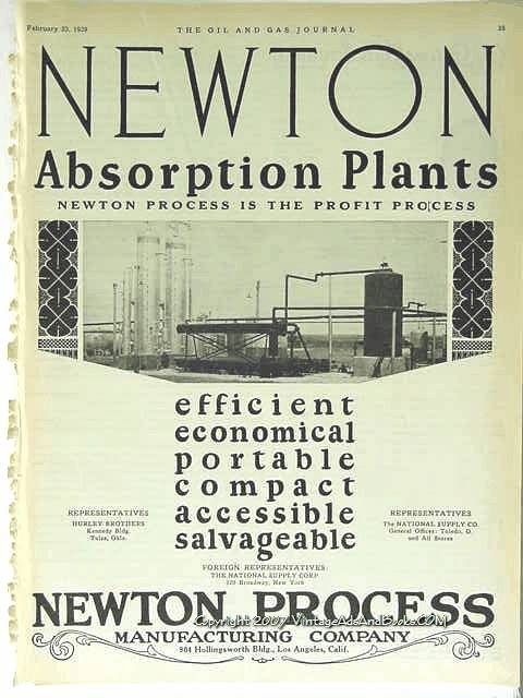 Original oil and gas trade magazine vintage ad for NEWTON PROCESS MANUFACTURING COMPANY, was located at 904 Hollingsworth Bldg., Los Angeles, CA. Representatives listed: HURLEY BROTHERS, was located in the Kennedy Bldg, in Tulsa, OK and The NATIONAL SUPPLY CO, located in Toledo OH. ABSORPTION PLANTS, Newton Process Is The Profit Process. This unique 1928 old petroleum refining industry magazine advertisement would look fabulous matted and framed. Nice graphics. Approximate size 10 x 13 inches.
