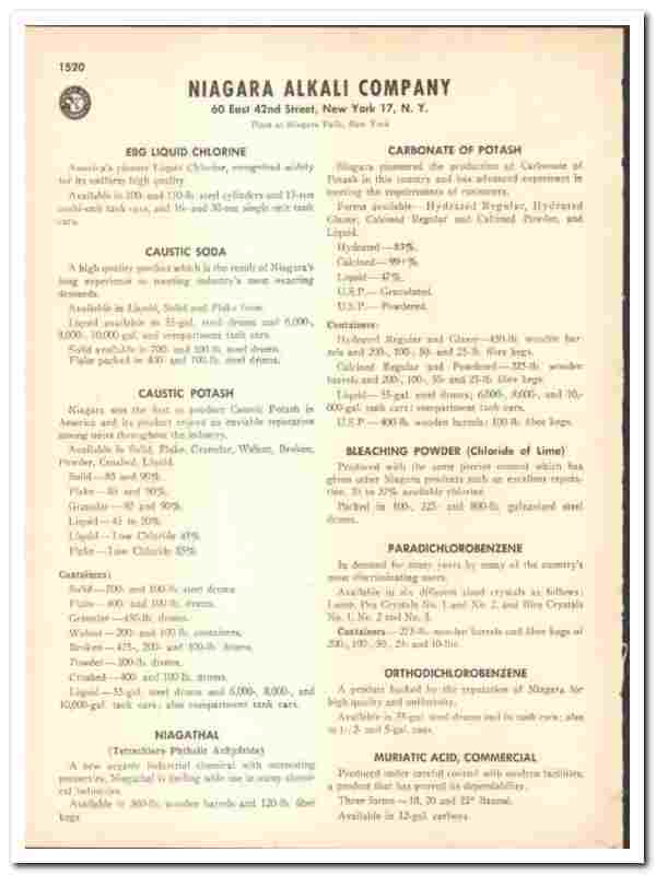 Original 1947 industrial chemical trade vintage catalog for the NIAGARA ALKALI COMPANY. Main office was located at 60 East 42nd Street, New York, NY.
