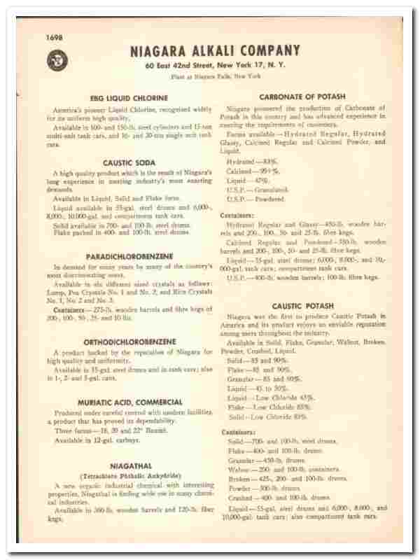 Original 1948 industrial chemical trade vintage catalog for the NIAGARA ALKALI COMPANY. Main office was located at 60 East 42nd Street, New York, NY. The plant was located in Niagara Falls, NY.
