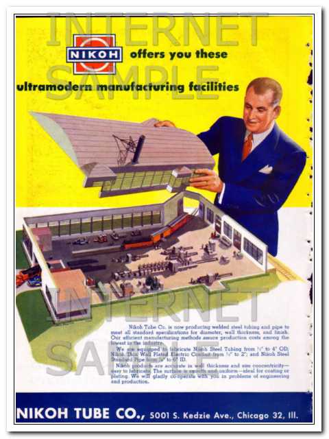 Original vintage magazine ad for NIKOH TUBE COMPANY of 5001 S Kedzie Ave., Chicago, IL. A new steel tube plant now at your service fabricating welded steel tubing and pipe. Old 1948 industrial advertisement. Would look fantastic matted and framed.