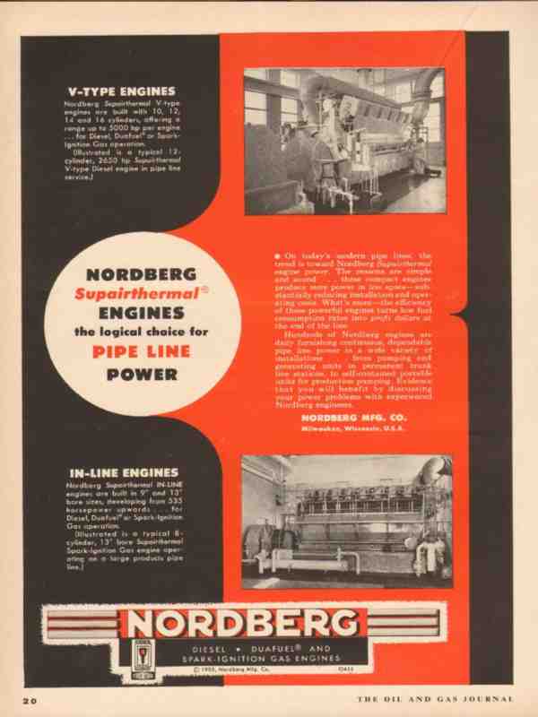 Original oil and gas trade magazine vintage ad for NORDBERG MANUFACTURING COMPANY of Milwaukee, WI. Supairthermal Engines are the Logical Choice for Pipe Line Power. V-Type and In-Line Engine. This unique 1955 old petroleum pipeline power industry magazine advertisement would display beautifully matted and framed.
