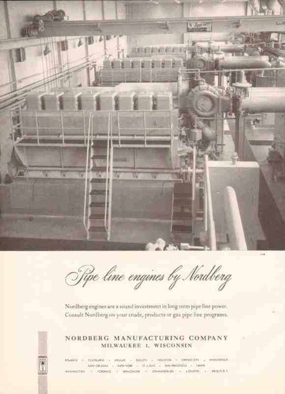 Original oil and gas trade magazine vintage ad for NORDBERG MANUFACTURING COMPANY of Milwaukee, WI. Pipe line engines are a sound investment in long term power. This unique 1959 old petroleum industry pipeline equipment magazine advertisement would display beautifully matted and framed.