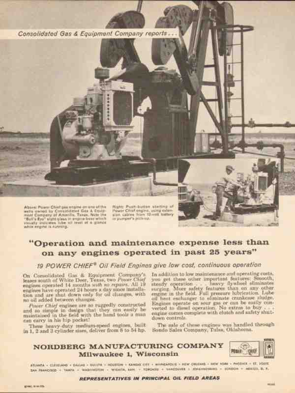 Original oil and gas trade magazine vintage ad for NORDBERG MANUFACTURING COMPANY of Milwaukee, WI.  Power Chief Oil Field Engines Give Low Cost, Continuous Operation.  Pictured is Power Chief engine on one of the wells owned by Consolidated Gas & Equipment Company of Amarillo, Texas. This unique 1962 old petroleum well drilling power equipment magazine advertisement would display beautifully matted and framed. Nice graphics.