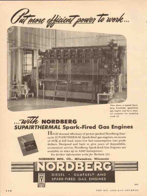 Original oil and gas trade magazine vintage ad for NORDBERG MANUFACTURING COMPANY of Milwaukee, WI.  Put More Efficient Power to Work with Nordberg Supairthermal Spark Fired Gas Engines. Used by Major Oil Companies for Pumping Crude Oil. Unique 1954 old oilfield petroleum industry power engine equipment advertisement.
