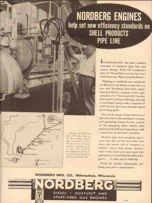 Original oil and gas trade magazine vintage ad for NORDBERG MANUFACTURING COMPANY of Milwaukee, WI.  Nordberg Engines Help Set New Efficiency Standards on Shell Products Pipe Line. The Shell pipe line runs between the Wood River refinery and terminals at Argo, IL and East Chicago. Unique 1954 old petroleum power engine industry equipment magazine advertisement.