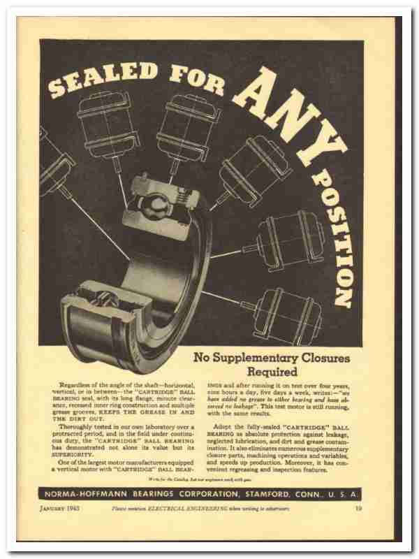 Original 1943 electrical trade vintage ad for NORMA-HOFFMANN BEARINGS CORPORATION. Main office and plant was located in Stamford, CT.
