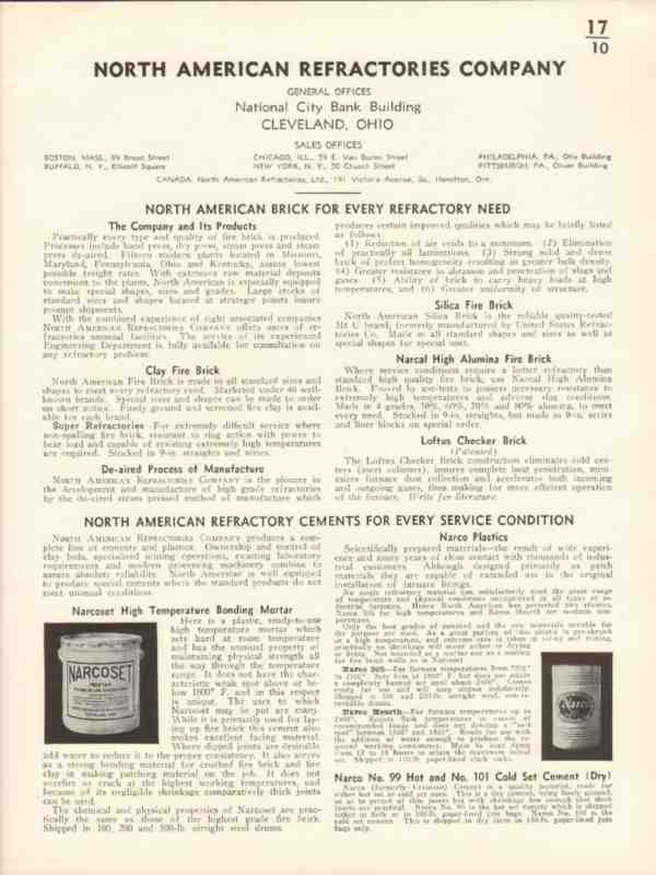 Original brick trade vintage catalog for NORTH AMERICAN REFRACTORIES COMPANY. Main office and plant was located in the National City Bank Building, Cleveland, OH. Manufacturers of Fire Bricks, Refractory Cement. Clay, Silica, Narcal High Alumina, Loftus Checker. Narcoset high temperature bonding mortar, plastics. This unique 1936 old one page technical engineering brochure would display beautifully matted and framed.