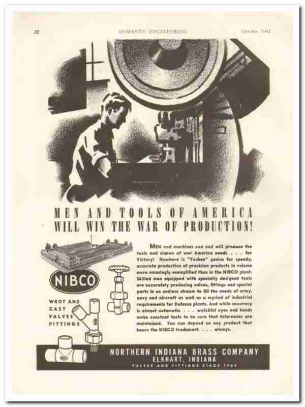 Original vintage magazine ad for NORTHERN INDIANA BRASS COMPANY. Men and tools will win the War of Production for Victory! Nowhere is Yankee genius for speedy, accurate production of precision products in volume more amazingly exemplified than in the NIBCO plant. Valves, fittings and special parts produced in an endless stream to fill the needs of army, navy and aircraft as well as a myriad of industrial requirements for Defense plants