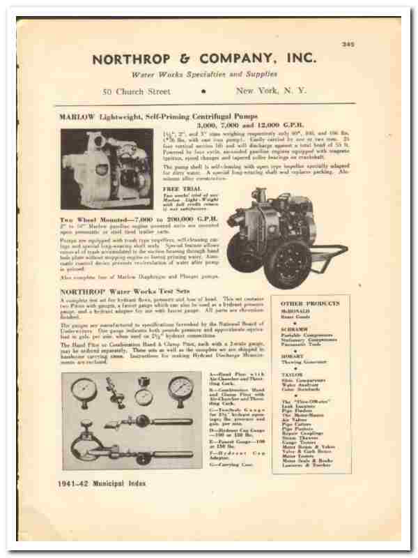 Products include the Marlow Lightweight Self-Priming Centrifugal Pumps and Northrop Water Works Test Sets, both are fully featured.