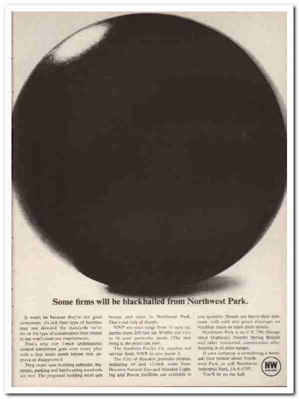 Original 1967 Houston business trade magazine vintage ad for the NORTHWEST INDUSTRIAL PARK. Located on U.S. 290 (Hempstead Highway). Houston, Texas, Nearby Spring Branch. Some firms will be blackballed from Northwest Park. Not because they are not good companies, but their type of business may not demand the standards we have set, or the type of construction they intend to use will not meet out requirements. This old one page real estate magazine advertisement would display beautifully matted and framed.