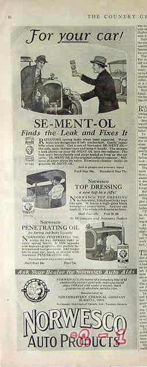 Original vintage magazine ad for NORTHWESTERN CHEMICAL COMPANY, of Marietta, OH. For Your Car! Se-Ment-Ol Finds the Leak and Fixes It. Top Dressing, Penetrating Oil. Old 1926 Norwesco automobile products advertisment.