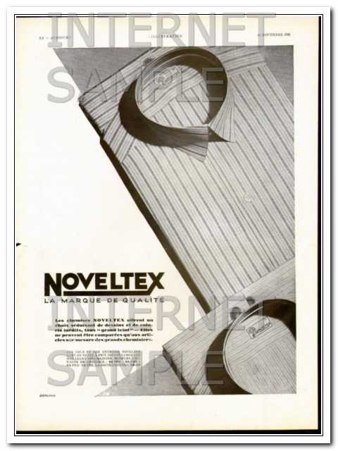 Original old elite French clothing magazine ad for NOVELTEX. Noveltex Men's Shirts, the Mark of Quality. Art by Dorland. Ad is written entirely in French. This 1930 art deco men's clothing advertisement would display beautifully matted and framed.