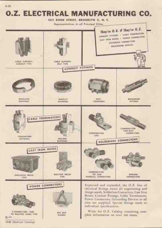 Original electrical trade vintage catalog for O. Z. ELECTRICAL MANUFACTURING COMPANY, was located at 262 Bond Street, Brooklyn, NY. Manufacturers of conduit fittings, iron boxes, cable terminators and solderless connectors meet all engineering and design needs. Disbound from a large 1948 electrical construction materials book, this unique old one page technical brochure would display wonderfully matted and framed. A marvelous addition to your retro electric equipment library.