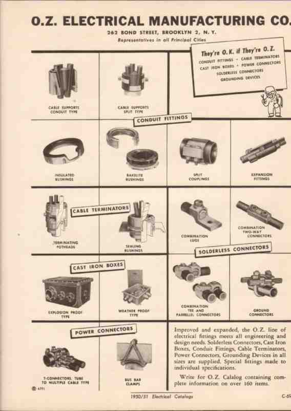Original electrical trade vintage catalog for O. Z. ELECTRICAL MANUFACTURING COMPANY, was located at 262 Bond Street, Brooklyn, NY. Manufacturers of conduit fittings, boxes, solderless connectors, cable terminators and grounding devices are supplied. Improved and expanded, the OZ line meets all engineering and design needs. Disbound from a large 1951 electrical construction materials book, this unique old one page technical brochure would display wonderfully matted and framed. A marvelous addition to your retro electric equipment library.