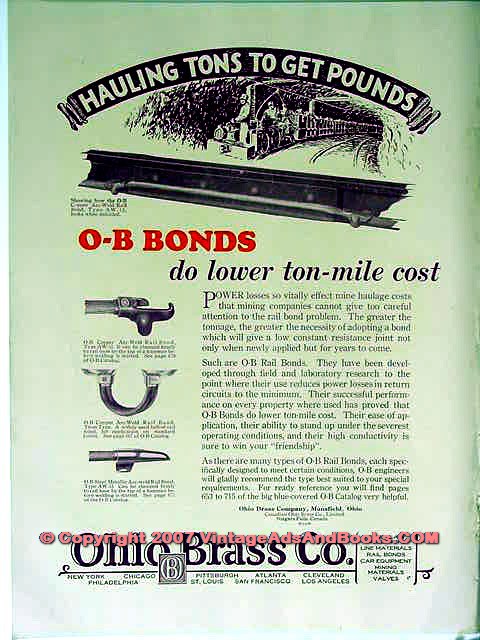 Original vintage mining magazine ad, OHIO BRASS COMPANY of Mansfield, OH. Hauling Tons to Get Pounds. O-B Bonds do Lower Ton-Mile Cost. Coal mine rails and equipment. Old 1928 coal mining industry advertisement. (The scan shows a slight bluish tint that is not on the actual ad.)