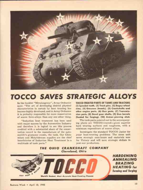 Original World War 2 heat heating process industry trade magazine vintage ad for THE OHIO CRANKSHAFT COMPANY of Cleveland, OH. Tocco Saves Strategic Alloys. Tocco Treated Parts of Tanks and Tractors. The world's fastest, most accurate heat treating process. Old 1943 dated WW2 wartime era propaganda magazine advertisement.