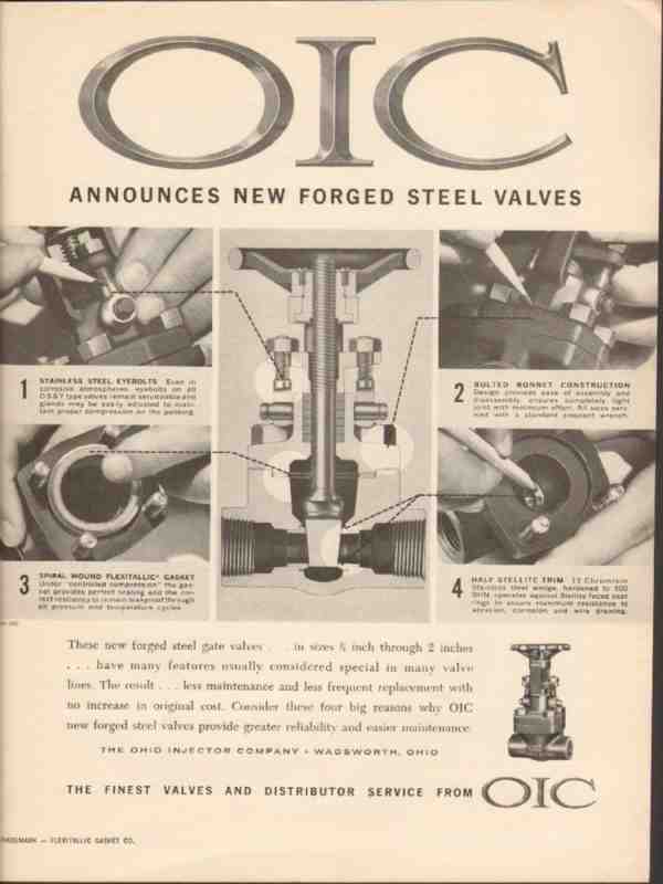Original oil and gas trade magazine vintage ad for THE OHIO INJECTOR COMPANY of Wadsworth, OH. OIC Announces New Forged Steel Gate Valves. This unique 1962 old oilfield petroleum industry valve equipment magazine advertisement would display beautifully matted and framed.