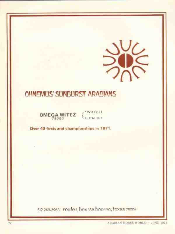 Original old equestrian trade magazine vintage ad for OHNEMUS SUNBURST ARABIANS in Boerne, TX. Omega Witez 78393 sire Witez II dam Little Bit. Over 40 firsts and championships in 1971. This unique 1972 Arabian horse breeding advertisement would display beautifully matted and framed.