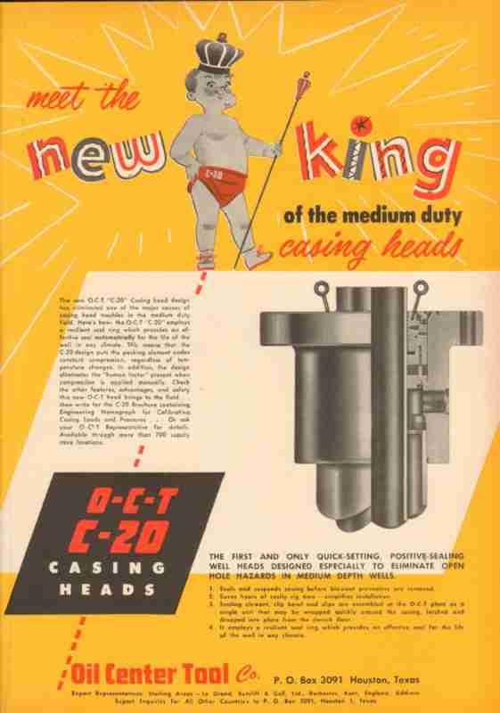 Original oil and gas trade magazine vintage ad for OIL CENTER TOOL COMPANY of Houston, TX.  New King of medium duty Casing Heads. O-C-T  C-20 head design has eliminated on of the major causes of troubles. It employs a resilient seal ring which provides an effective seal automatically for the life of the well in any climate. The first and only quick-setting, positive-sealing well heads designed to eliminate open hole hazards in medium depth wells. This unique 1953 old oilfield petroleum well equipment magazine advertisement would display beautifully matted and framed. Nice graphics.