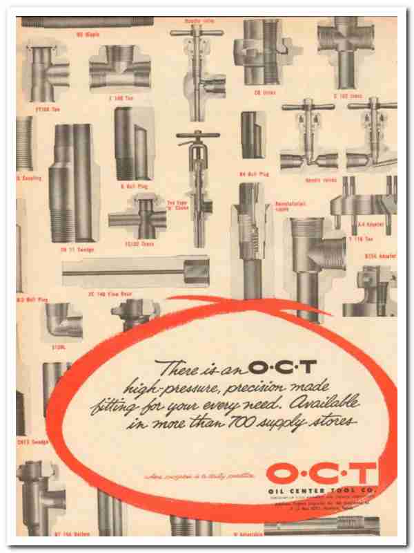 Original oil and gas trade magazine vintage ad for OIL CENTER TOOL COMPANY of Houston, TX. O-C-T High-Pressure Fittings for your every need, precision made. Available in more than 700 supply stores. This unique 1959 old oilfield petroleum well equipment magazine advertisement would display beautifully matted and framed.