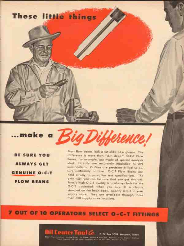 Original oil and gas trade magazine vintage ad for OIL CENTER TOOL COMPANY of Houston, TX.  These Little Things Make a Big Difference!  Get Genuine O-C-T Flow Beans. Unique 1954 old oilfield petroleum industry equipment magazine advertisement. Nice graphics.
